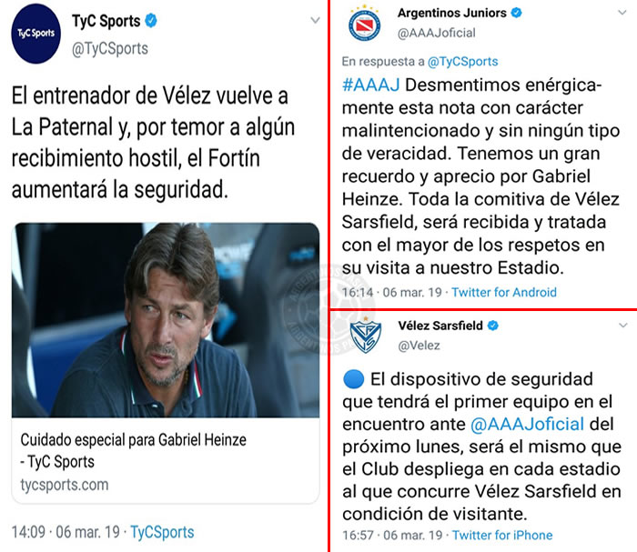 Por la tarde, el canal de deportes argentino, TyC Sports, publicó una nota en la cual decía que Gabriel Heinze, ex técnico de Argentinos Juniors, actual DT del “Fortín” vuelve a La Paternal y por temor a un recibimiento hostil, Vélez Sarsfield va a aumentar la seguridad.
