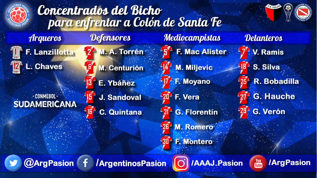 Argentinos Juniors: Lucas Chaves; Jonathan Sandoval, Miguél Torrén, Carlos Quintana y Enzo Ybáñez; Matías Romero, Fausto Vera y Franco Moyano; Victorio Ramis, Gabriel Hauche y Santiago Silva.