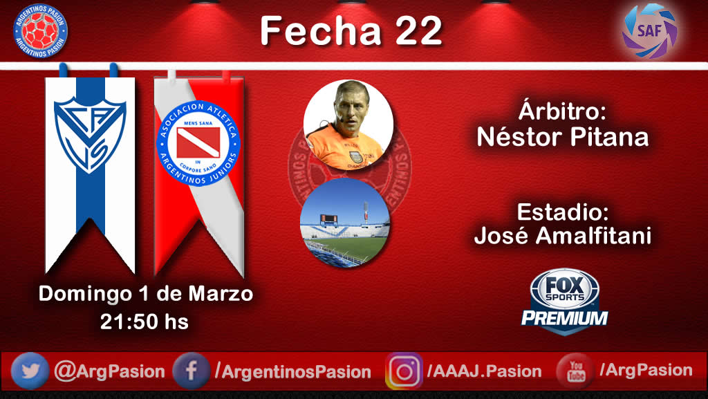 Este domingo a las 21:50, por la fecha 22 de la Superliga, Argentinos Juniors viajará a Liniers para verse las caras con Vélez en el Estadio José Amalfitani. El árbitro será Néstor Pitana.