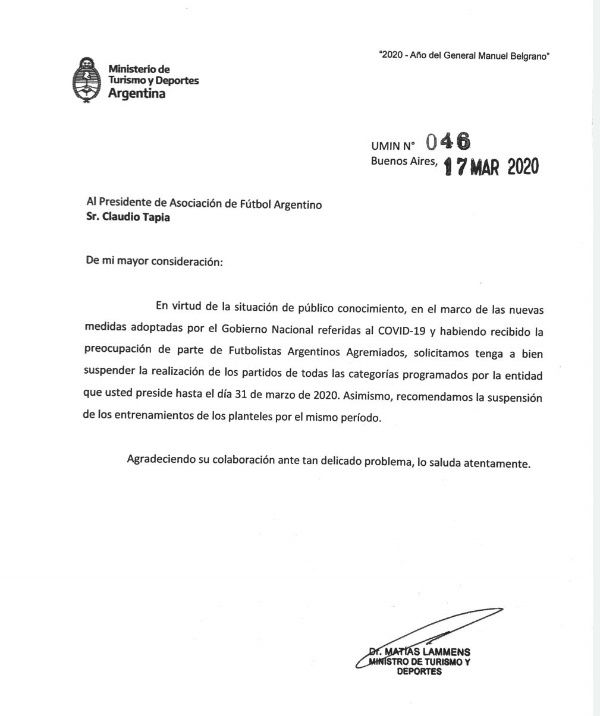 Matías Lammens, Ministro de Turismo y Deportes, envió una nota a la Asociación del Fútbol Argentino y otra al presidente de la Superliga, Marcelo Tinelli. solicitando suspender las actividades: “En virtud de la situación de público conocimiento, en el marco de las nuevas medidas adoptadas por el Gobierno Nacional referidas al COVID-19, y habiendo recibido la preocupación de parte de Futbolistas Argentinos Agremiados, solicitamos tenga a bien suspender la realización de los partidos de todas las categorías programados por la entidad que usted preside hasta el 31 de Marzo de 2020. Asimismo, recomendamos la suspensión de los entrenamientos de los planteles por el mismo período.”