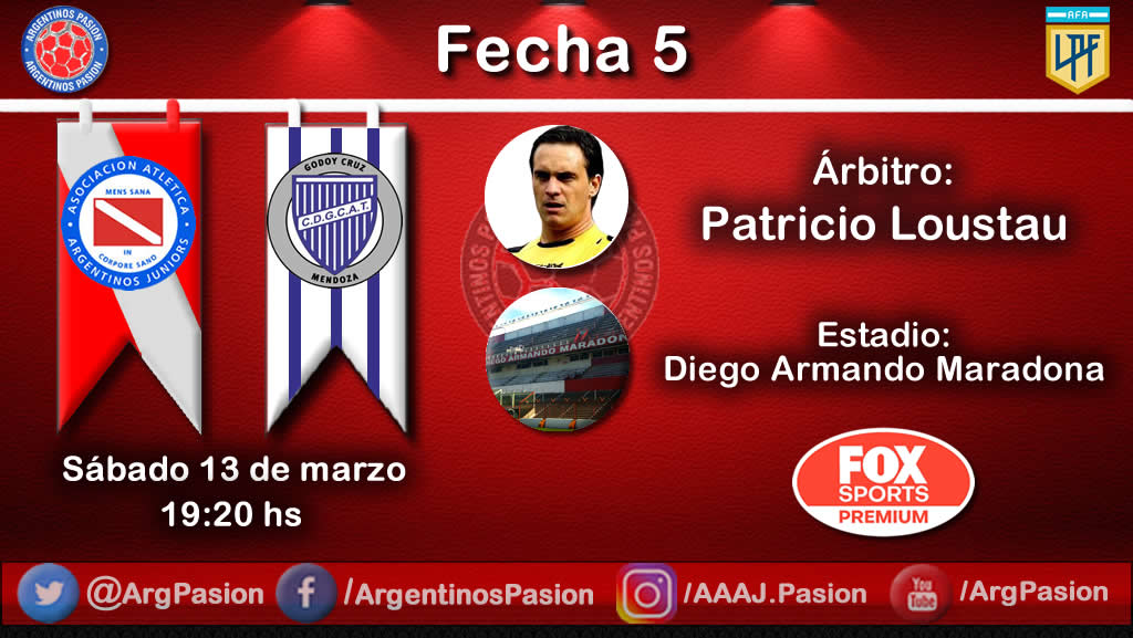 Por la fecha 5 de la Copa de la Liga, Argentinos Juniors recibe a Godoy Cruz el sábado a las 19:20 hs. El encuentro se disputará en el Estadio Diego Armando Maradona, con el arbitraje de Patricio Loustau.