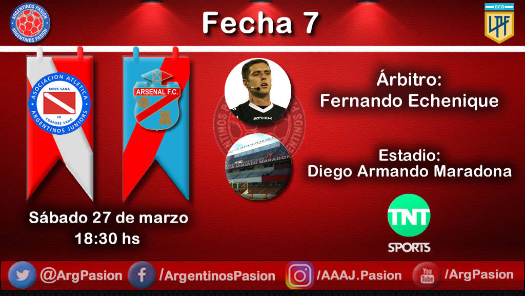 El sábado a las 18:30 hs., por la fecha 7 de la Copa LPF, Argentinos Juniors recibe a Arsenal en el Estadio Diego Armando Maradona, con el arbitraje de Fernando Echenique y transmisión de Argentinos Pasión. El conjunto de Gabriel Milito viene mejorando en lo futbolístico, aunque llega de una derrota en su visita a Racing. Mientras tanto, enfrente estará Arsenal, con un presente muy malo, ya que, en 6 fechas, aún no conoce la victoria.