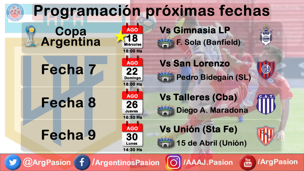 Para cerrar el mes, aparece otra jornada entre semana: el jueves 26, a las 16:30 hs, Argentinos recibirá por la fecha 8 a Talleres de Córdoba. Por último, el Bicho viajará a Santa Fe para visitar a Unión el lunes 30, a las 14:30 hs, por la fecha 9.