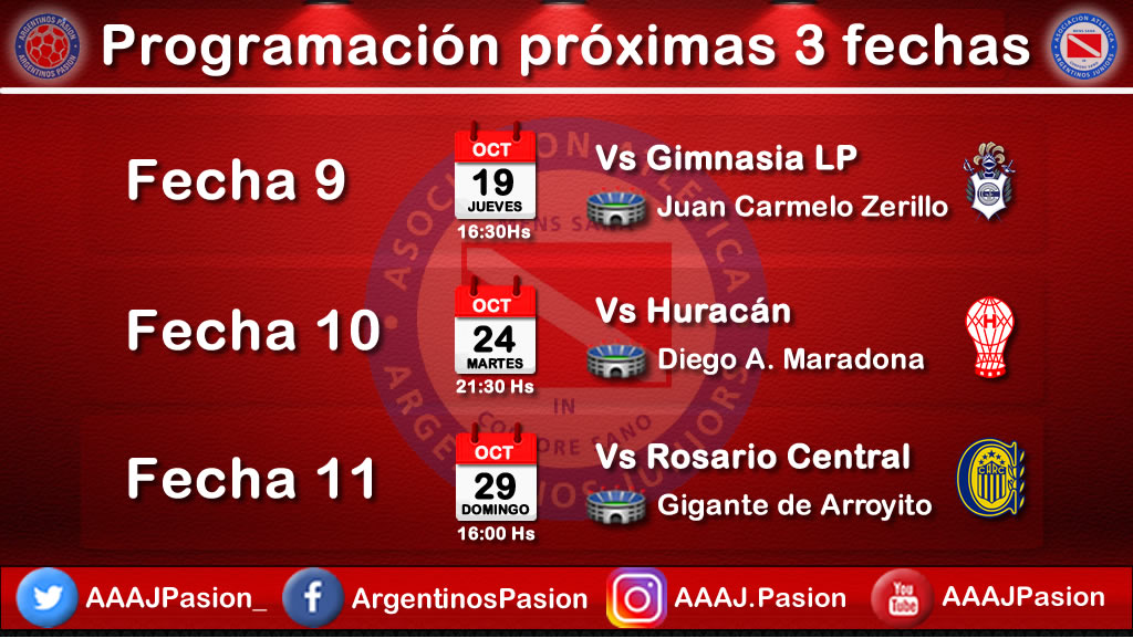 El jueves 19 de octubre el Bicho viajará a La Plata para verse con el Lobo, que pelea por mantener la categoría, luego de las elecciones presidenciales que se desarrollarán el domingo 22 de octubre, recibirá el martes 24 (día del hincha de Argentinos Juniors) a Huracán, otro de los que pelean por zafar de la zona de descenso y finalmente el domingo 29 de octubre, viajará a Rosario para enfrentar a Central en el Gigante de Arroyito.