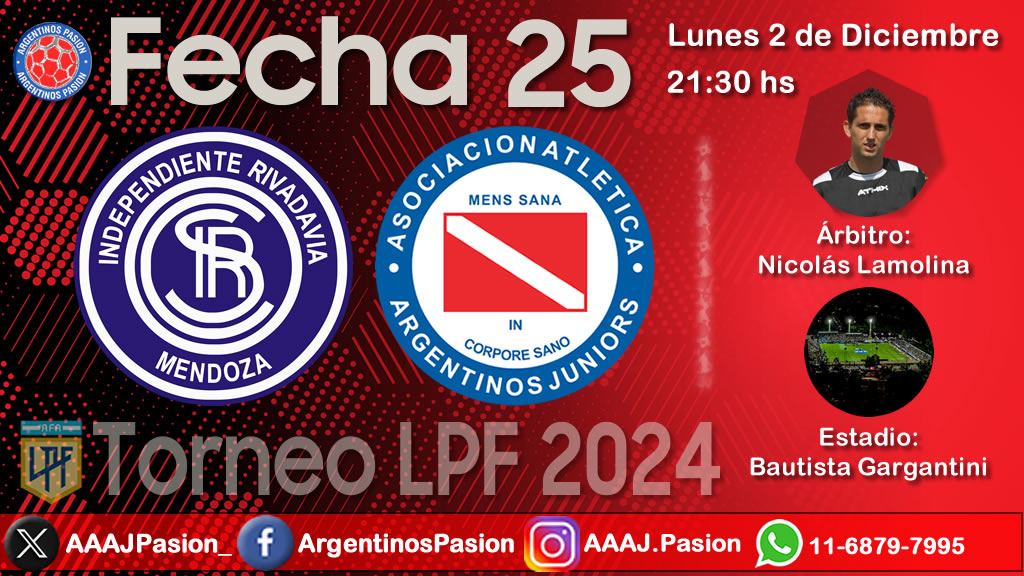 Argentinos Juniors viaja a Mendoza para enfrentarse al Club Sportivo Independiente Rivadavia este lunes desde las 21:30 hs en un encuentro correspondiente a la fecha Nº25 de la Liga Profesional de Fútbol en el Estadio Bautista Gargantini.