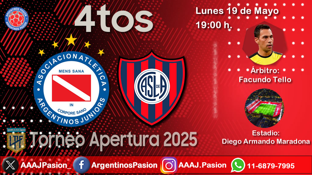 Argentinos Juniors y San Lorenzo de Almagro se enfrentarán este lunes desde las 19:00 h. por los 4tos de final del Torneo Apertura de la Liga Profesional de Fútbol en el Estadio Diego Armando Maradona. En caso de empate en los 90′ reglamentarios se definirá por disparos desde el punto de penal. El ganador de este encuentro deberá enfrentarse, por semifinales, al que salga triunfante del duelo entre River Plate y Platense.