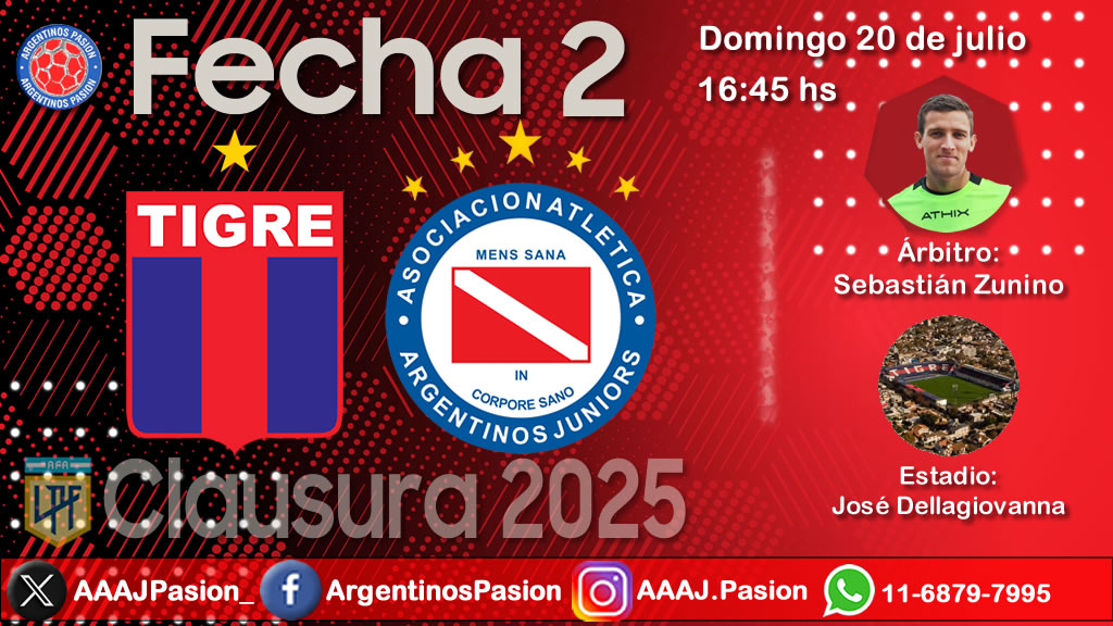 Por la fecha Nº 2 del Torneo Apertura de la Liga Profesional de Fútbol en un partido correspondiente a la Zona A, Argentinos Juniors visitará al Club Atlético Tigre en el Estadio José Dellagiovanna este domingo desde las 16:45 hs.