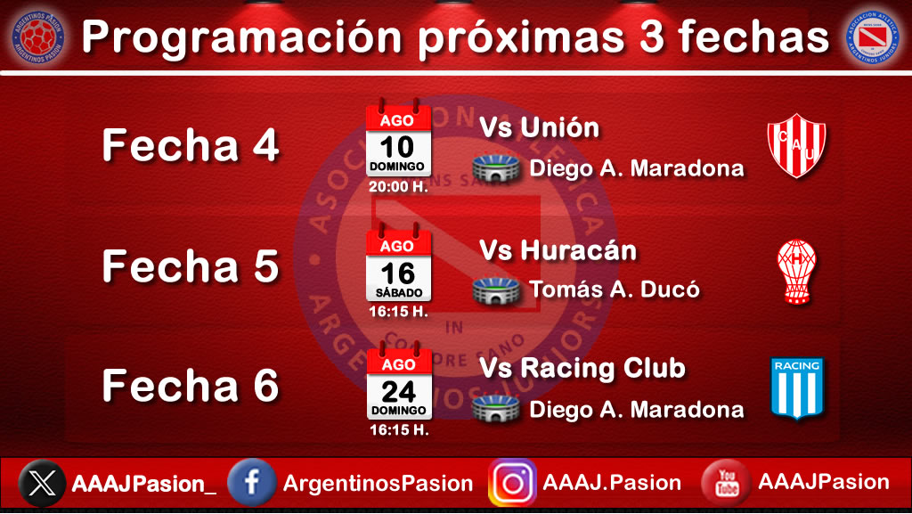 – Fecha Nº 4: Argentinos Juniors vs. Unión de Santa Fe – Domingo 10/08 20:00 h. (L)