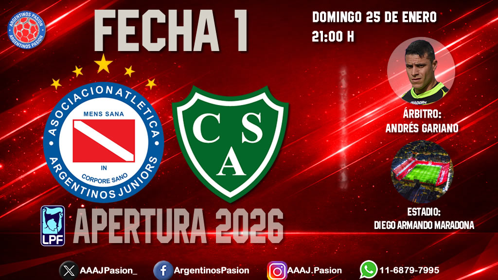 Argentinos Juniors y el Club Atlético Sarmiento de Junín abren su participación en el Torneo Apertura 2026 de la Liga Profesional de Fútbol, enfrentándose en un partido correspondiente a la Fecha Nº1 de la Zona B, a jugarse este domingo desde las 21:00 h en el Estadio Diego Armando Maradona