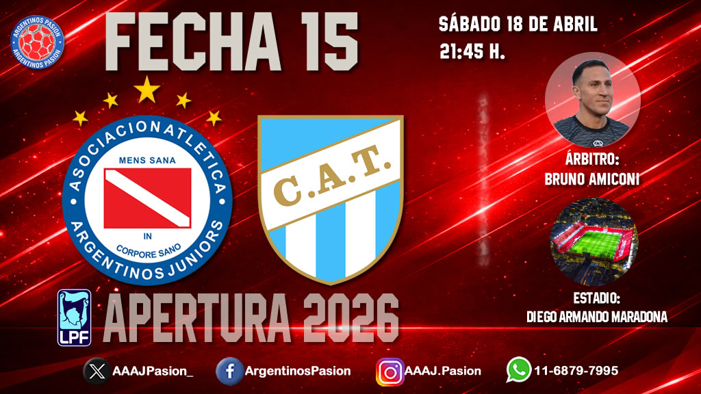 Por la fecha Nº15 del Torneo Apertura de la Liga Profesional de Fútbol, Argentinos Juniors recibe en el Estadio Diego Armando Maradona, al Club Atlético Tucumán, este sábado desde las 21:45 h en un encuentro correspondiente a la Zona B de dicha competencia.